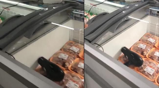 a101 markette, tavuk ürünlerinin yer aldığı derin dondurucunun içerisine fön makinesi konulup çalıştırıldığı görüldü.