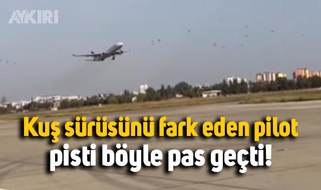 Adana Havalimanı’na iniş yaptığı esnada kuş sürüsünü fark eden pilot, son anda pisti pas geçti. O anlar kameraya yansıdı.
