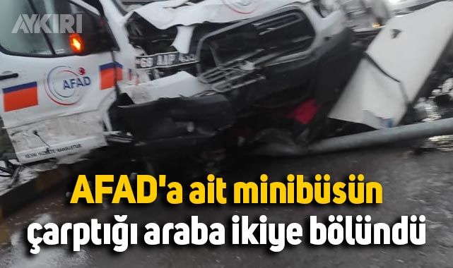 Nevşehir'de AFAD'a ait minibüsün çarptığı araba ikiye bölündü.