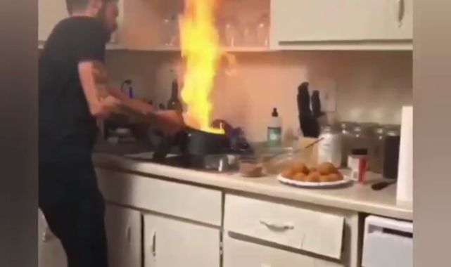 Görüntüler Yurtdışından...Mutfağa girdiğinde yanan tencereye müdahele etmek isteyen adam, çeşmeyi açarak yanmakta olan yağın üzerine su döktü. alev alan yağı söndürmek isterken mutfağın her yerini alevler içinde bıraktı. O anlar sosyal medyada yüzlerce kez izlendi.
