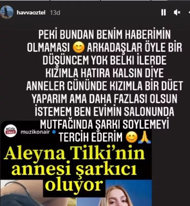 Havva Öztel açıklamasında "Arkadaşlar öyle bir düşüncem yok. Belki ileride kızımla hatıra kalsın diye Anneler Günü'nde kızımla bir düet yaparım ama daha fazlası olsun istemem. Ben evimin salonunda, mutfağında şarkı söylemeyi tercih ederim" dedi.