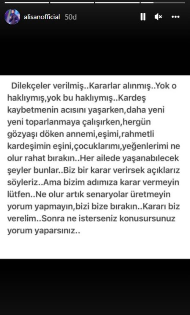 Instagram hesabından paylaşım yapan Alişan, "Dilekçeler verilmiş, kararlar alınmış. Yok o haklıymış, yok bu haklıymış. Kardeş kaybetmenin acısını yaşarken, daha yeni yeni toparlanmaya çalışırken, her gün gözyaşı döken annemi, eşimi, rahmetli kardeşimin eşini, çocuklarımı, yeğenlerimi ne olur rahat bırakın. Her ailede yaşanabilecek şeyler bunlar. Biz bir karar verirsek açıklarız söyleriz. Ama bizim adımıza karar vermeyin Iütfen. Ne olur artık senaryolar üretmeyin yorum yapmayın, bizi bize bırakın. Kararı biz verelim. Sonra ne isterseniz konuşursunuz yorum yaparsınız" dedi.