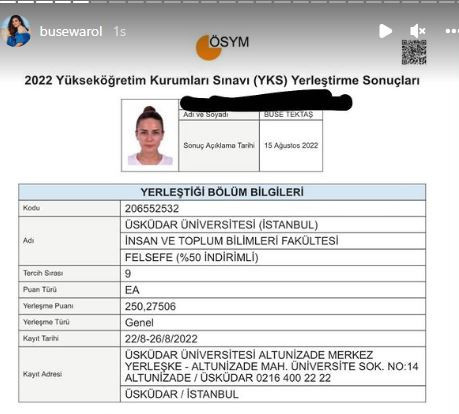 250 puan alan Buse Varol, 'Üsküdar Üniversitesi İnsan ve Toplum Bilimleri Fakültesi, Felsefe Bölümü'ne yüzde 50 burslu olarak yerleştiğini gösteren belgeyi paylaştı.