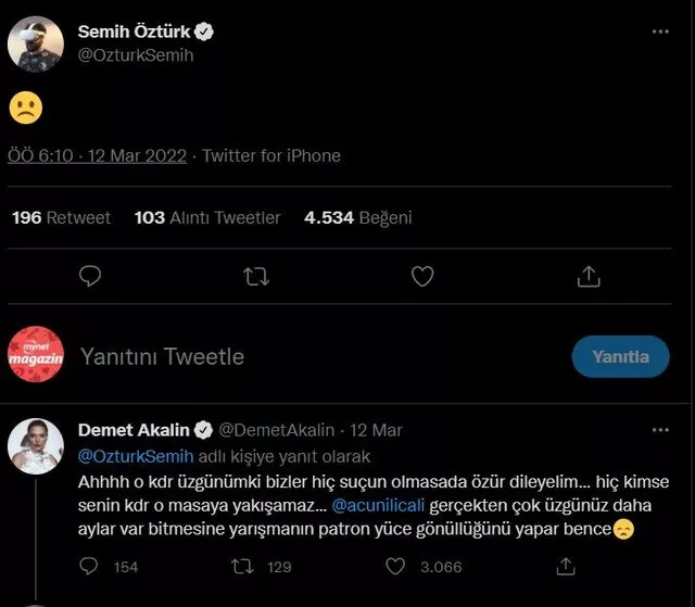 "Kovuldu" iddiasının ardından sosyal medya hesabından "Üzgün surat" emojisi paylaşan Semih Öztürk'e Demet Akalın'dan destek geldi. Akalın, Öztürk adına Acun Ilıcalı'dan özür diledi.