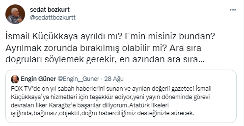 “İsmail Küçükkaya ayrıldı mı? Emin misiniz bundan?” diye soran Bozkurt, “Ayrılmak zorunda bırakılmış olabilir mi? Ara sıra doğruları söylemek gerekir, en azından ara sıra” diyerek Küçükkaya’nın kendi isteğiyle ayrılmadığını ima etti.