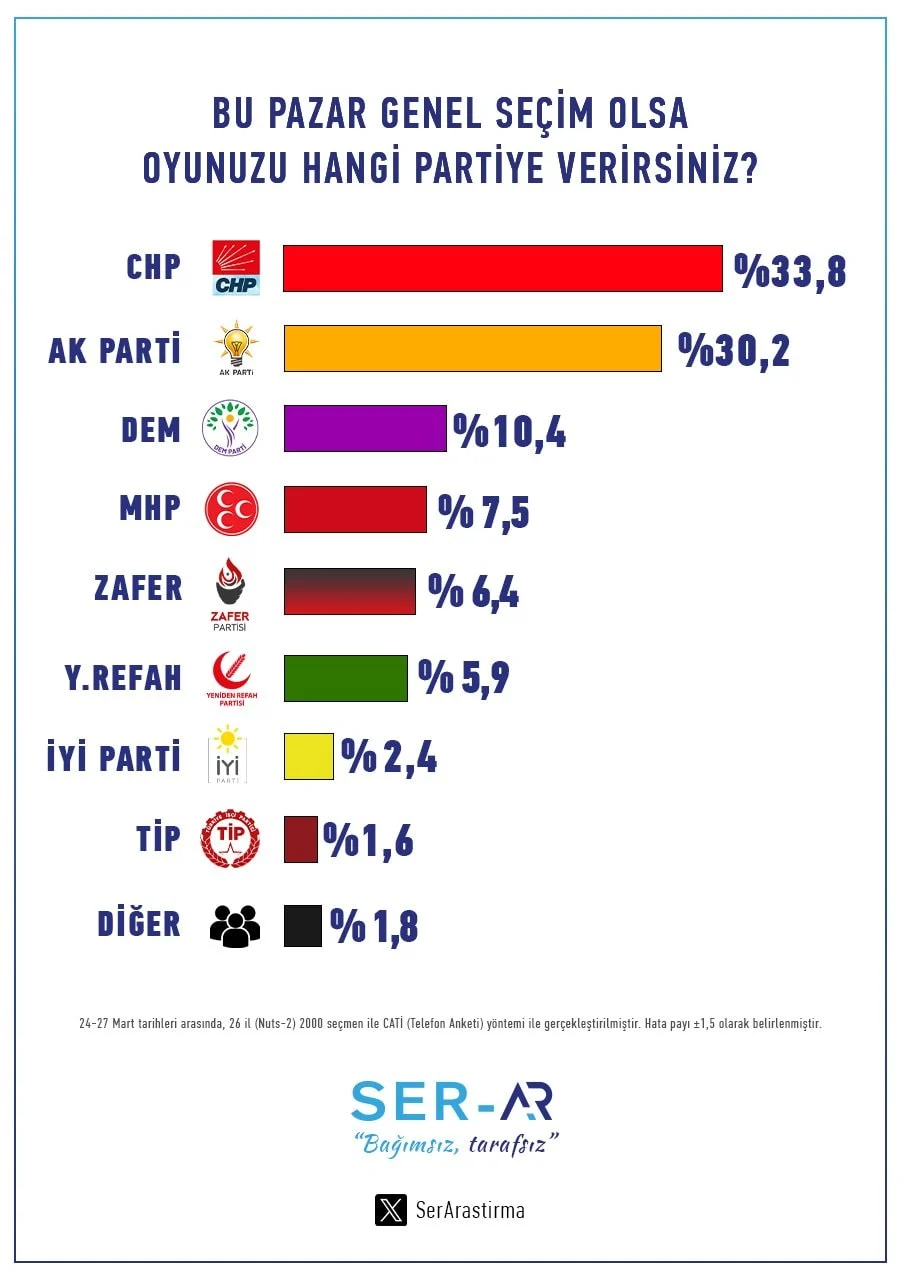 Ser Araştırma'nın 24-27 Mart tarihleri arasında 26 ilde 2 bin kişiyle CATI (Bilgisayar Destekli Telefonda Anket) yöntemiyle yaptığı çalışmada; CHP'nin yüzde 33,8 ile birinci parti olduğu görüldü. AKP'nin ise yüzde 30,2 ile ikinci sırada kaldığı saptandı.MHP'DE OY DESTEĞİ AZALDI