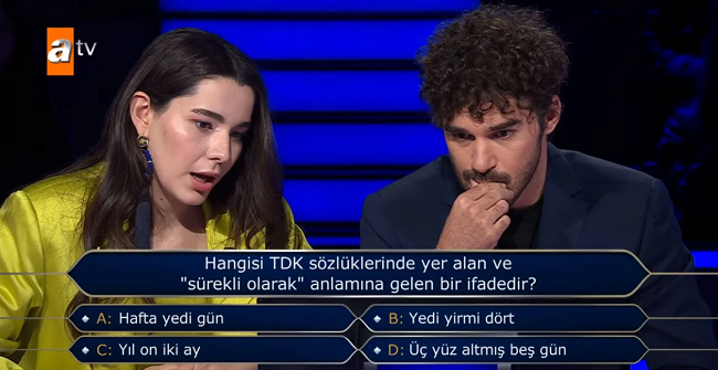 Yusuf Çim ve Feyza Sevil Güngör 200 bin TL'lik soruda takıldı. Ünlü oyunculara "Hangisi TDK sözlerinde yer alan ve sürekli olarak anlamına gelen bir ifadedir?" sorusu soruldu. Başarılı oyuncular soruyu bilemeyince çekilme kararı aldı. İkili yarışmadan 100 bin TL ile ayrıldı. Sorunun cevabı ise "C" şıkkı "Yıl on iki ay" çıktı.