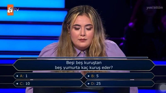 Kenan İmirzalıoğlu'nun sorduğu soru karşısında heyecanına yenik düşen yarışmacı soruya 25 yanıtını verdi. Doğru yanıtın farklı olması yarışmacıyı şaşırttı. Kenan İmirzalıoğlu ise cevabın '5' olma sebebini yarışmacıya açıkladı. Dilara Tayfun, Milyoner'den 2 bin TL para ödülüyle ayrıldı.