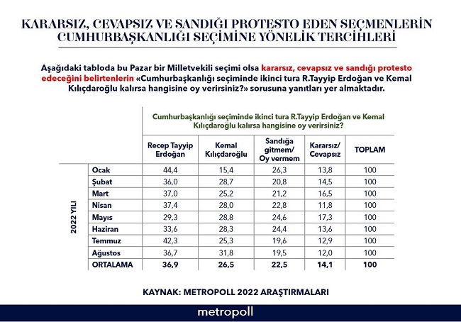 Ocak ayında Erdoğan ile Kemal Kılıçdaroğlu karşı karşıya kalırsa 'Kılıçdaroğlu'na oy veririm' diyen kararsız seçmenin yüzdesi 15,4 iken Ağustos ayında yüzde 31,8 oldu. Erdoğan'a oy veririm diyen seçmenin oranı ise yüzde 44,4 iken Ağustos'ta yüzde 36,7'ye düştü.