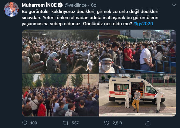 Konu hakkında sosyal medya hesabından paylaşım yapan İnce "Bu görüntüler kaldırıyoruz dedikleri, girmek zorunlu değil dedikleri sınavdan. Yeterli önlem almadan adeta inatlaşarak bu görüntülerin yaşanmasına sebep oldunuz. Gönlünüz razı oldu mu?" ifadelerini kullandı.