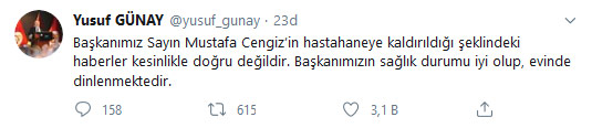 Günay paylaşımında; "Başkanımız Sayın Mustafa Cengiz’in hastahaneye kaldırıldığı şeklindeki haberler kesinlikle doğru değildir. Başkanımızın sağlık durumu iyi olup, evinde dinlenmektedir. " dedi.