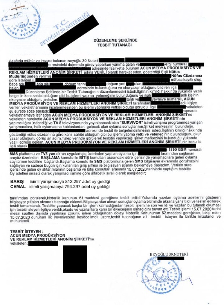 Sonuçların olduğu iddia edilen belgeye göre, Survivor 2020'nin finalinde yapılan SMS oylaması sonucunda finalist Barış Murat Yağcı'nın 812 bin 257 adet oy aldığı, bir diğer finalist Cemal Can Cansever'in ise 794 bin 297 oy aldığı gözüküyor.