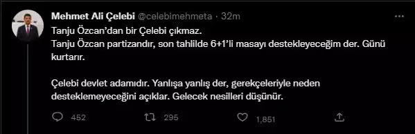 “Tanju Özcan’dan bir Çelebi çıkmaz. Tanju Özcan partizandır, son tahlilde 6+1’li masayı destekleyeceğim der. Günü kurtarır. Çelebi devlet adamıdır. Yanlışa yanlış der, gerekçeleriyle neden desteklemeyeceğini açıklar. Gelecek nesilleri düşünür.”