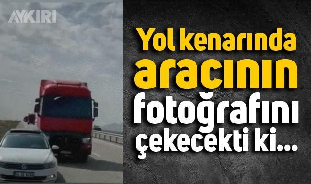 Aracını karşıdan görecek bir açıyla fotoğraf çekmeye hazırlanan adam, arkadan gelen kamyonun aracına sürtmesiyle büyük bir şok yaşadı.